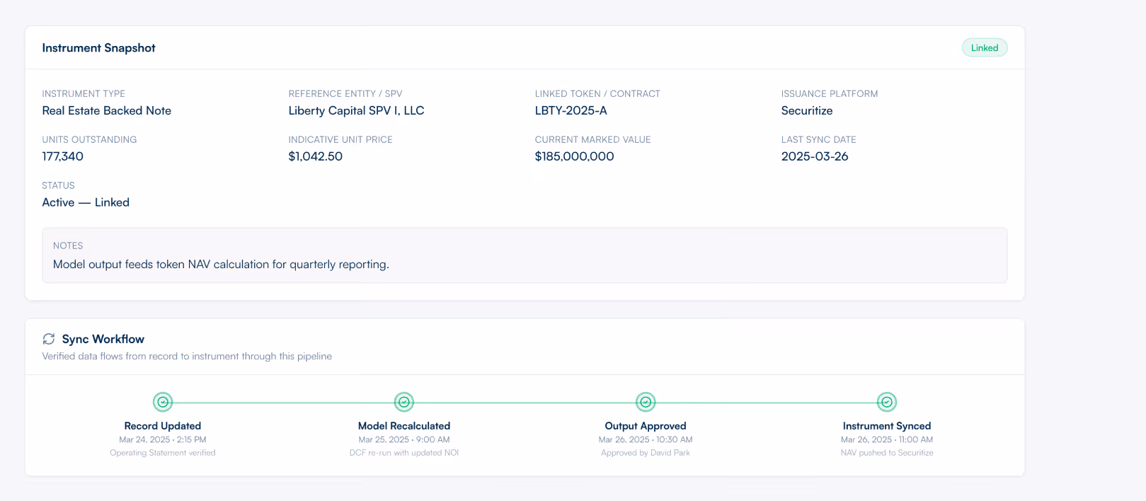 When the record changes, the model updates. When the model is approved, the instrument syncs. Building connects verified asset data all the way to digital instruments, ownership transfers, and downstream market participants — with provenance included at every step.