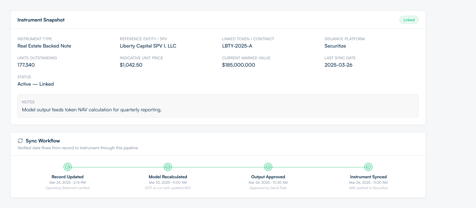 When the record changes, the model updates. When the model is approved, the instrument syncs. Building connects verified asset data all the way to digital instruments, ownership transfers, and downstream market participants — with provenance included at every step.